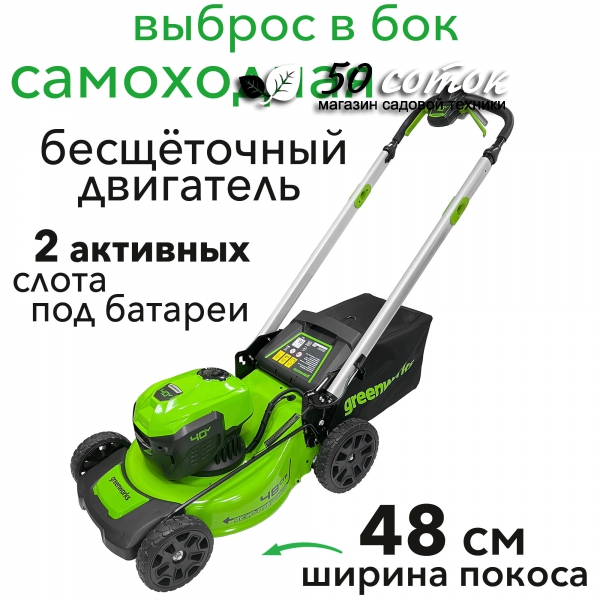 Газонокосилка аккумуляторная Greenworks GD40LM48SP - это мощная, универсальная и практичная самоходная газонокосилка из линейки 40V. Регулируемая скорость позволяет без труда обрабатывать большие участки. Газонокосилка оснащена передовым бесщеточным двигателем, который резко снижает вибрации и требует минимального обслуживания.