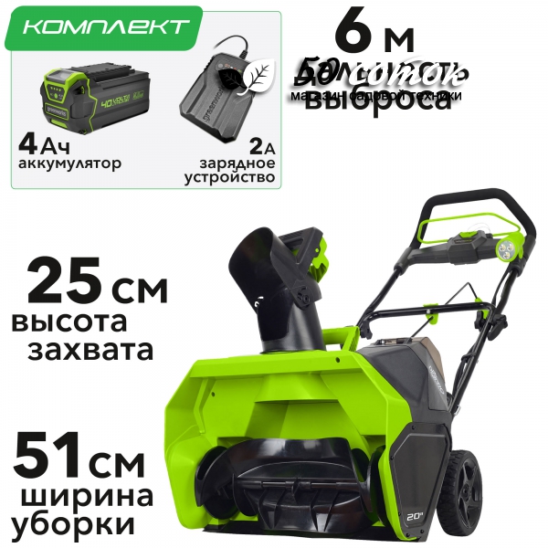Аккумуляторный снегоуборщик Greenworks GD40STK4, код (21854)