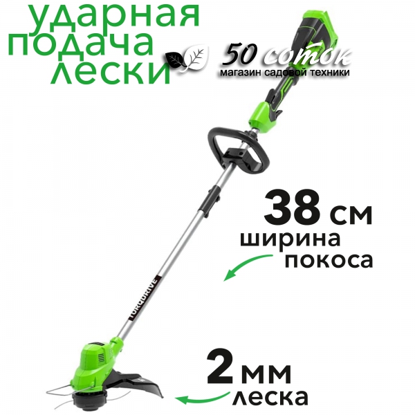 Триммер Greenworks GD40LT 40V 2112207 (38 см) аккумуляторный — триммер с шириной скашивания 38 см из серии 40V для покоса травы на даче или приусадебной территории. Диаметр лески 2 мм. Оснащен системой TORQDRIVE для увеличения крутящего момента.