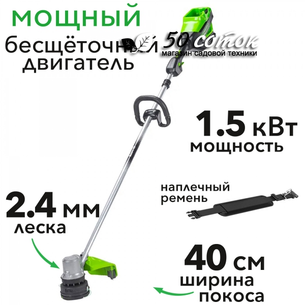 Триммер Greenworks ST161S 82V 2112307 (43 см) 1,6 кВт бесщеточный аккумуляторный — триммер с шириной скашивания 43 см и леской 2,4 мм из серии 82V для кошения травы на средних и больших площадях. Имеет верхнее расположение двигателя. Оснащен бесщеточным двигателем.