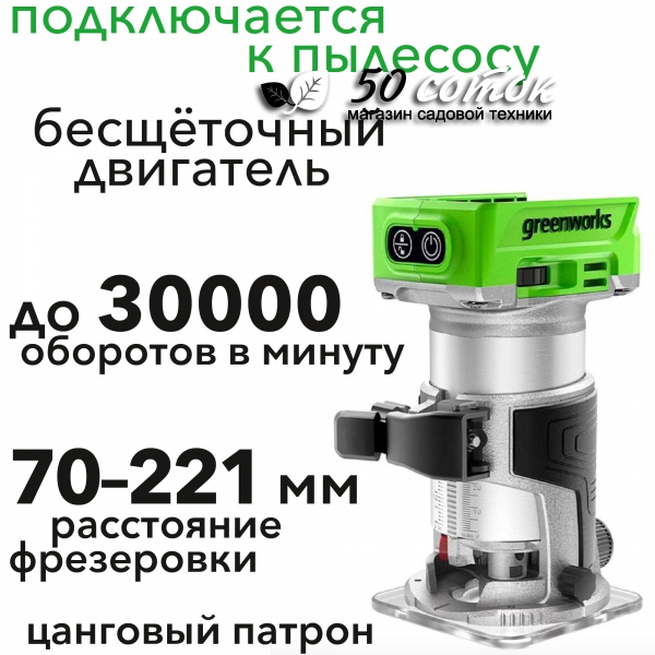 - Фрезер аккумуляторный Greenworks Арт. 3502507, 24V, бесщеточный, без АКБ и ЗУ - предназначен для фрезерование пазов и обработки кромок деревянных изделий.