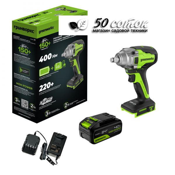 Гайковерт ударный бесщеточный Greenworks GD24IW400K4 24V 3802907CUB, код (24639)