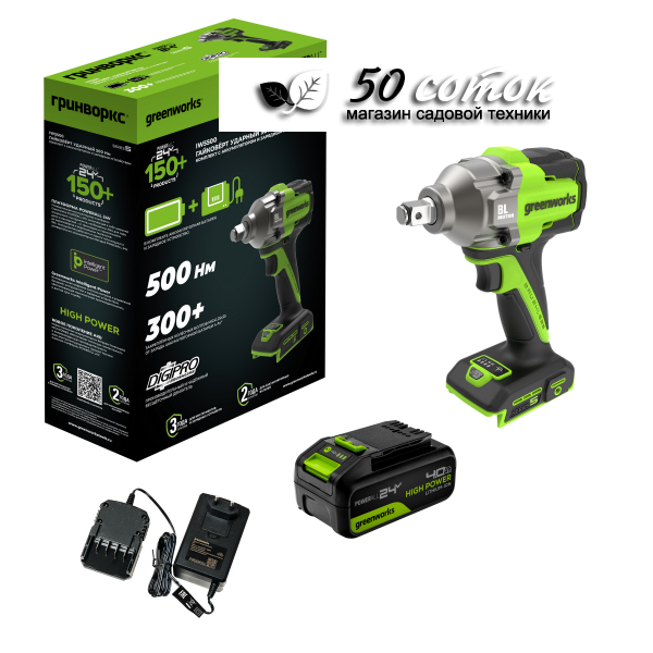 Гайковерт ударный акк. Greenworks IW5500, 24V, б/щет, 1/2'', 500Нм, 3 режима, 1х4Ач,ЗУ,кор (3805007CUB)