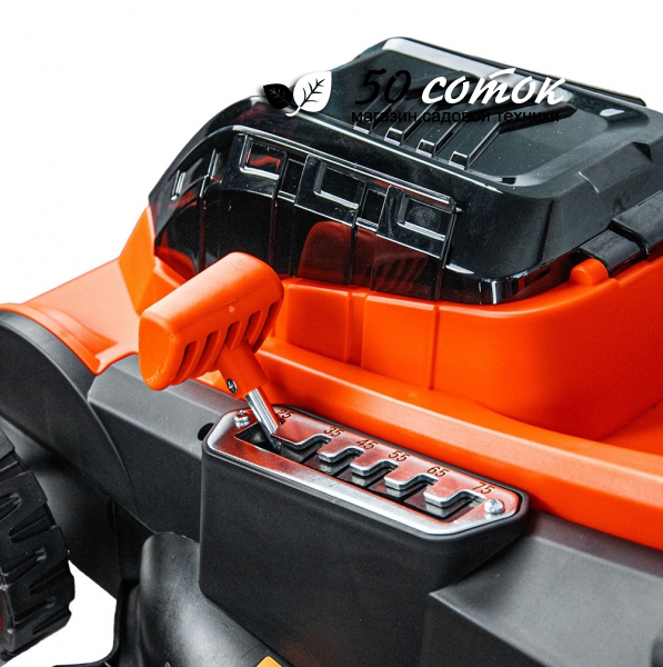 - Центральная регулировка высоты, 6 уровней высоты скашивания ( от 25см до 75см);