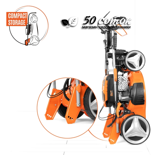- Вертикальное хранение. Современная конструкция двигателя и складная рукоятка позволяют компактно хранить газонокосилку в вертикальном положении.