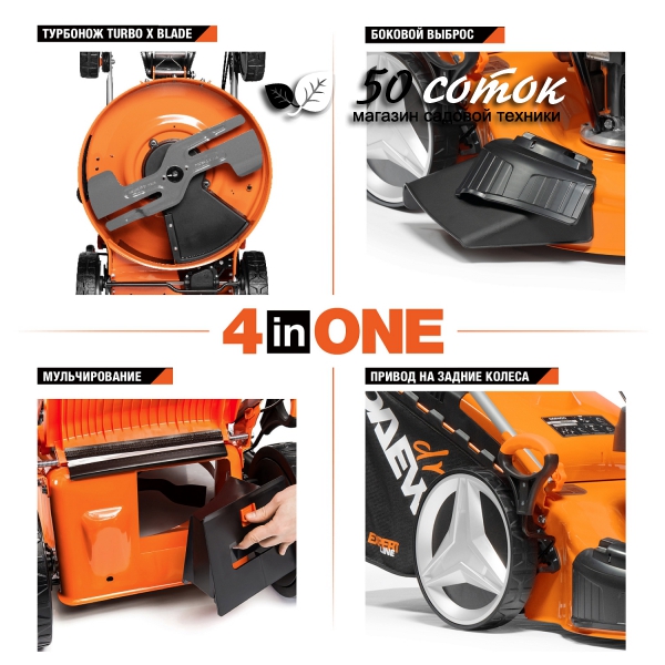 - Функции 4-в-1. Кошение, сбор травы в травосборник, боковой выброс и мульчирование. Конструкция газонокосилки и нож TURBO X BLADE позволяют быстро менять режим работы без использования инструментов и замены ножа, обеспечивая удобное решение любых задач по уходу за газоном.