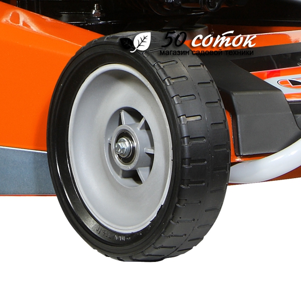 Ширина скашивания 53 см позволяет за один проход обрабатывать широкую полосу газона, сокращая общее время работы. Центральная регулировка высоты скашивания в 9 положениях в диапазоне от 20 до 75 мм помогает точно настроить высоту травы под сезон, тип покрытия и желаемый внешний вид газона.