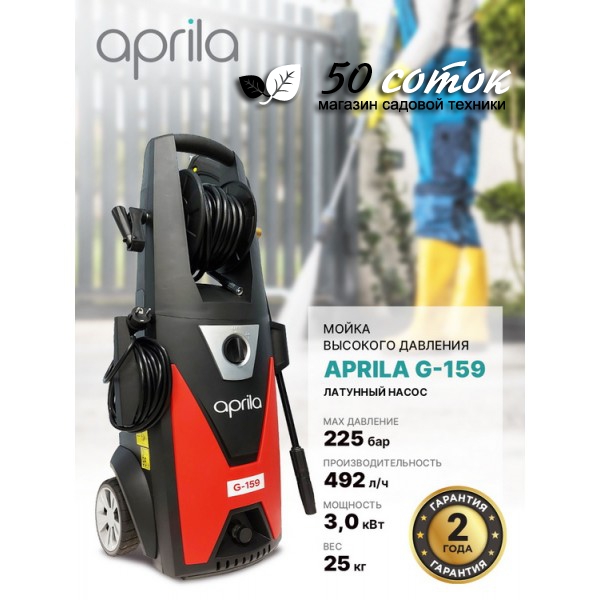 Бытовая мойка высокого давления Aprila G-159 без подогрева воды с барабаном для намотки шланга высокого давления. Для бытового использования. Мобильная минимойка Aprila G-159 высокого давления предназначена для мытья автомобилей, мебели, садовых дорожек, стен фасада, зон барбекю, патио и т.д.