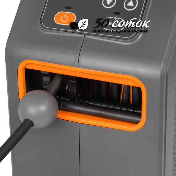- 30-метровый шланг на катушке с электроприводом. Армированный шланг длиной 30м устойчив к заломам и позволяет комфортно работать на большой территории. Встроенный электропривод катушки смотает шланг одним нажатием кнопки на корпусе мойки или удаленно на пистолете. Также можно легко установить необходимую для работы длину шланга.