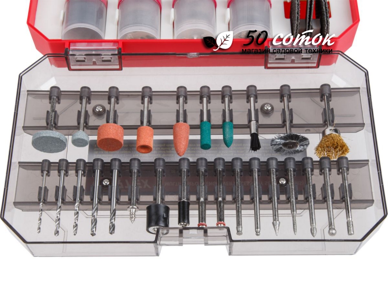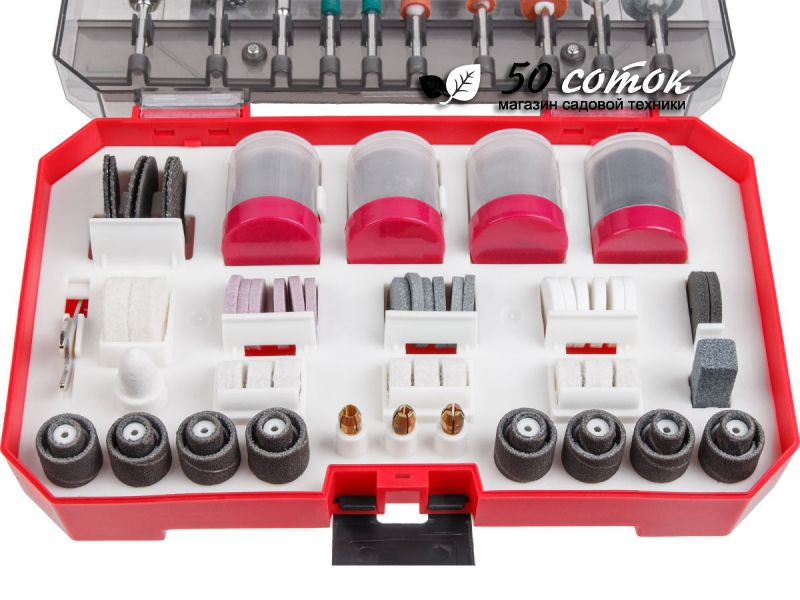 Универсальный набор аксессуаров для гравера содержит 272 предметов, состоит из: 8 шт. шлифовальных лент: 6,3 мм x 12,7 мм 8 шт. шлифовальных лент: 12,7 мм x 12,7 мм 3 шт. цанги: 1,6 мм, 2,4 мм, 3,2 мм 1 шт. камень для очистки и заточки абразивных насадок 25,4 мм x 9,5 мм 9 шт. войлочных кругов: 12,7 мм x 6,3 мм 1 шт. войлочный круг заостренный 1 шт. гаечный ключ: 3/8" 2 шт. резиновый наждачный круг 18 шт. шлифовальных кругов 2 шт. войлочных кругов: 25,4 мм x 6,3 мм 36 шт. отрезных кругов: 23,8 мм x 0,4 мм 150 шт. наждачных листов 6 шт. отрезных кругов со стекловолокном 5 шт. спиральных сверл из быстрорежущей стали 1 шт. шлифовальный хвостовик под ленту: 6,3 мм x 12,7 мм 1 шт. шлифовальный хвостовик под ленту: 12,7 мм x 12,7 мм 2 шт. оправки для отрезных кругов 1 шт. оправка для войлочного круга 7 шт. алмазных фрез 5 шт. шлифовальных насадок с хвостовиком 2 шт. резиновых шлифовальных насадок 1 шт. полировальная щетка из медной проволоки 1 шт. полировальная щетка из проволоки 1 шт. полировальная щетка из нейлона