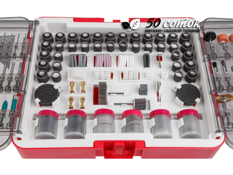Универсальный набор аксессуаров для гравера содержит 418 предметов, состоит из: 20 шт. шлифовальных лент: 6,3 мм x 12,7 мм 16 шт. шлифовальных лент: 9,5 мм x 12,7 мм 20 шт. шлифовальных лент: 12,7 мм x 12,7 мм 12 шт. шлифовальных кругов 6 шт. шлифовальных кругов по камню 1 шт. алмазный отрезной круг 2 шт. резиновый наждачный круг 1 шт. гаечный ключ: 3/8"" 2 шт. войлочный круг: 25,4 мм x 6,3 мм 6 шт. войлочный круг: 12,7 мм x 6,3 мм 2 шт. войлочный круг заостренный 1 шт. камень для очистки и заточки абразивных насадок 25,4 мм x 9,5 мм 2 шт. лепестковый круг 10 шт. отрезных кругов со стекловолокном 4 шт. цанги: 1,6 мм, 2,4 мм, 3,2 мм 200 шт. наждачных листов 30 шт. отрезных кругов для тяжелых условий эксплуатации: 23,8 мм x 0,8 мм 36 шт. отрезных кругов обычных: 23,8 мм x 0,4 мм 9 шт. спиральных сверл HSS 1 шт. фреза HSS 10 шт. алмазных фрез 3 шт. резиновых шлифовальных камней 3 шт. оправок для круга 1 шт. шлифовальный хвостовик: 6,3 мм x 12,7 мм 1 шт. шлифовальный хвостовик: 9,5 мм x 12,7 мм 1 шт. шлифовальный хвостовик: 12,7 мм x 12,7 мм 10 шт. шлифовальных насадок с хвостовиком 1 шт. присоска 2 шт. проволочная полировальная щетка 3 шт. нейлоновая полировальная щетка 2 шт. медная проволочная полировальная щетка.