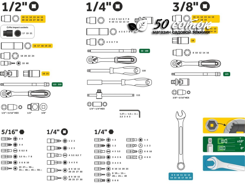 + Головка торцевая 3/8": 10, 11, 12, 13, 14, 15, 16, 17, 18, 19 мм;