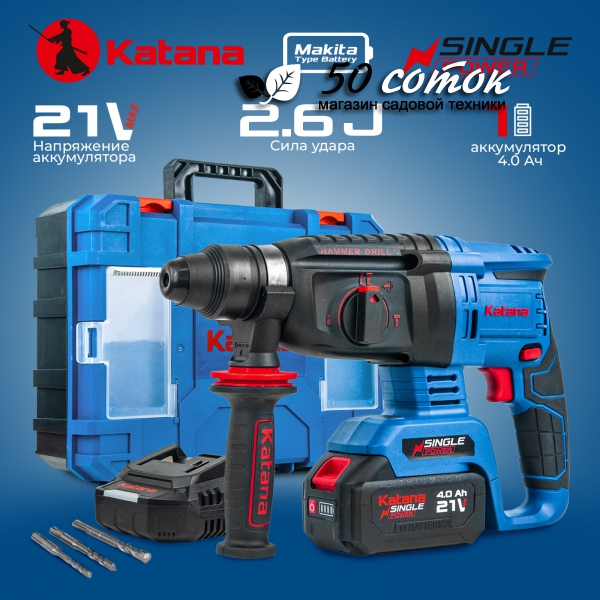 Перфоратор аккумуляторный KATANA RH6501 поставляется с аккумулятором и зарядным устройством. Перфоратор является представителем семейства Single Power, а значит совместим со всеми аккумуляторами платформы. Согласно Вашим задачам и потребностям аккумуляторы нужной ёмкости серии Single Power можно приобрести отдельно.