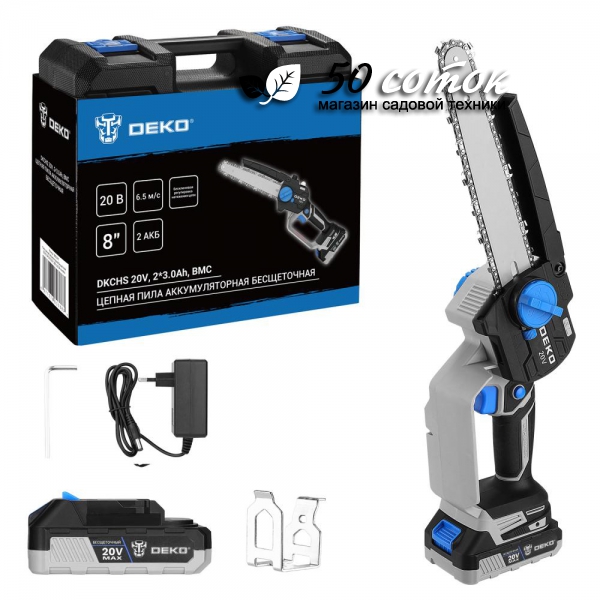 - Пила цепная аккумуляторная бесщеточная DEKO DKCHS 20V, 20В, 2x3.0Ач в кейсе незаменима при работе в мастерской или в саду для распиливания различных материалов.