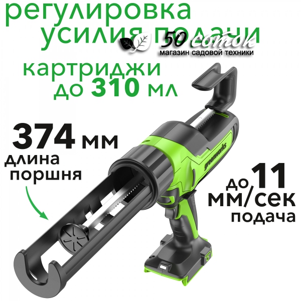 Пистолет для герметика Greenworks G24CAU 24V аккумуляторный — пистолет для герметика 24V для всех материалов в картриджах объёмом до 310 мл. плавную регулировку скорости и защиту от капель. Скорость подачи до 10 мм/с.