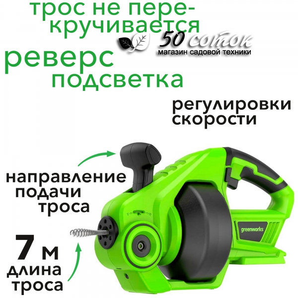 Трос сантехнический аккумуляторный Greenworks G24DA, (арт. 3707307), 24V, без АКБ и ЗУ - это современный инструмент для прочистки сантехнических труб.