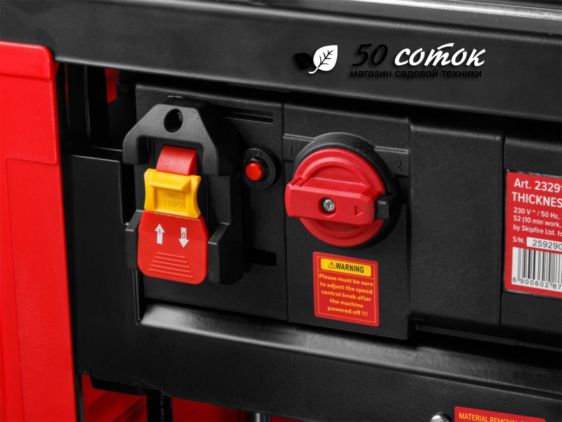 Рейсмусовый станок создан для точной, чистой и стабильной обработки заготовок из дерева в мастерских. Трехножевой вал обеспечивает высокое качество строгания с минимальным количеством последующей шлифовки, а увеличенная ширина и глубина строгания позволяют обрабатывать более крупные детали за меньшее число проходов. Две скорости подачи дают возможность добиваться более качественного результата при работе с различными типами древесины. Для удобства и чистоты рабочего процесса станок оснащен патрубком для подключения пылесоса, а раскладные стальные удлинители рабочего стола с роликами надежно поддерживают длинные заготовки, предотвращая завалы и задиры. Рукоятка регулировки высоты в сочетании с наглядной миллиметровой шкалой обеспечивает точную обработку. Безопасность и надежность работы обеспечиваются защитой от перегрузки и кнопкой восстановления термопредохранителя, что защищает двигатель в тяжелых условиях эксплуатации. Легкий доступ к угольным щеткам упрощает обслуживание и продлевает срок службы инструмента. Для удобства перемещения предусмотрены боковые рукоятки, а устойчивость на рабочей поверхности обеспечивают резиновые опоры и отверстия для жесткого крепления к столу. Материал: боковые крышки - пластик, верхняя крышка - сталь, основание и корпус - алюминий