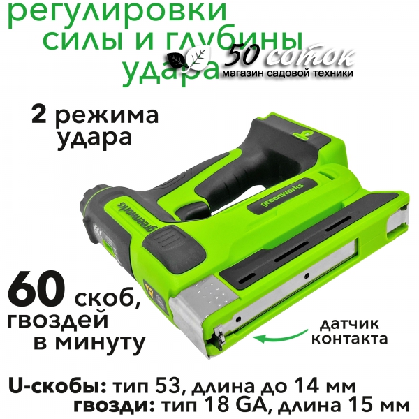Степлер аккумуляторный Greenworks G24CS10 24В - степлер из серии 24В для скрепления деталей в отделочных работах. Имеет скорость забивания 60 скоб/мин, лоток для скоб 100 шт. Оснащен 2 режимами работы, датчиком контакта. Тип скоб 18GA/Т50.