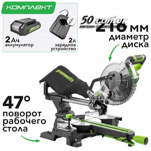 Торцовочная пила Greenworks GD24MS216 24V работает от аккумулятора 24V совместимого c 70 инструментами для сада, дома и мастерской из линейки Greenworks 24V.