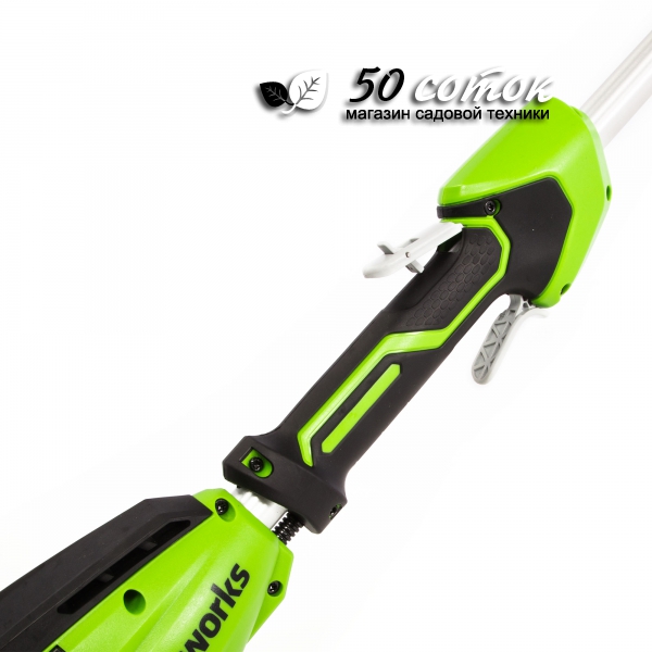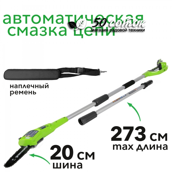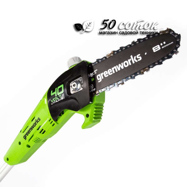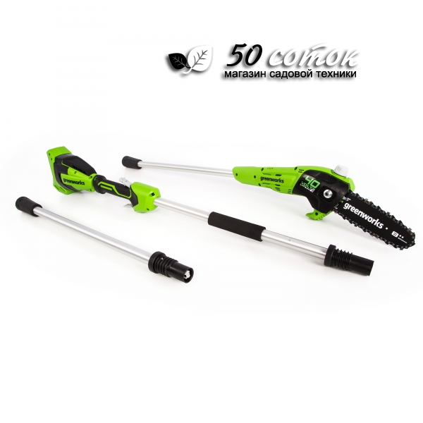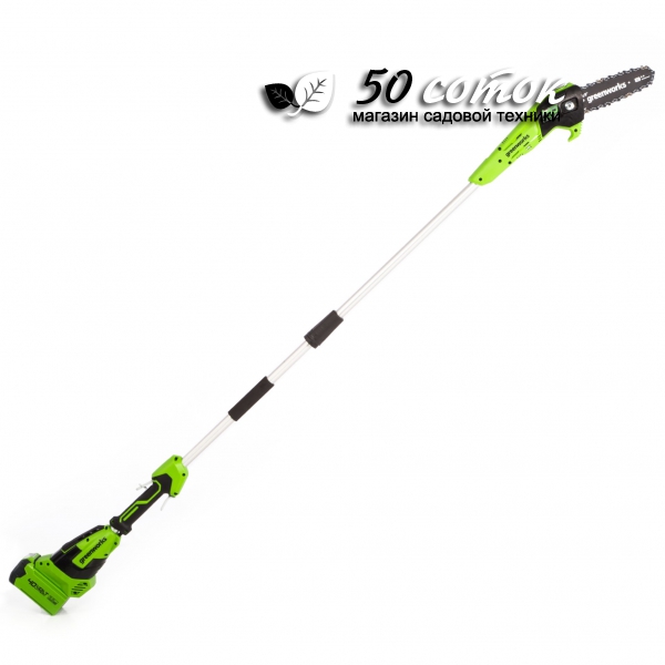 Высоторез (сучкорез) аккумуляторный Greenworks серии 40 вольт (модель G40PSF) с легкостью справиться с обрезкой ветвей и сучьев на высоте до 4-х метров.