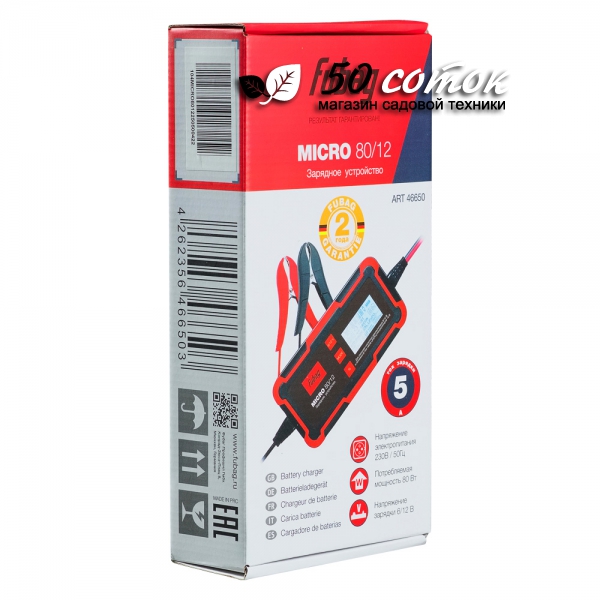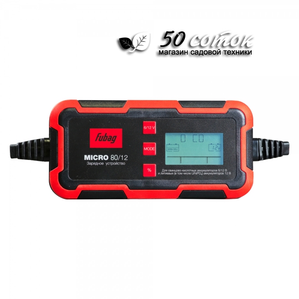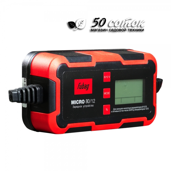 - FUBAG MICRO 80/12 — многофункциональное интеллектуальное зарядное устройство, созданное для обслуживания свинцово-кислотных аккумуляторов с номинальным напряжением 6 и 12 В, а также литиевых аккумуляторов 12 В, включая LiFePO4. Устройство способно заряжать аккумуляторы емкостью от 2 до 140 А·ч.